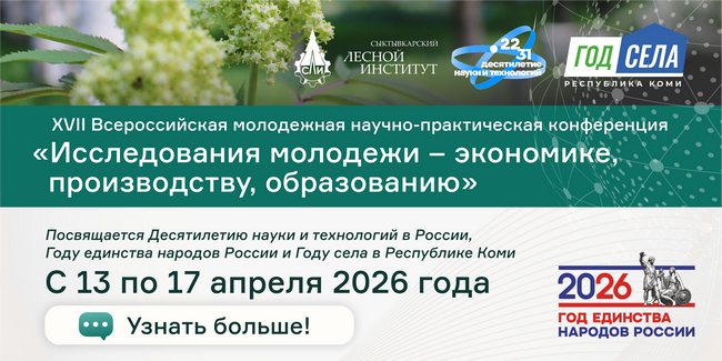 10.04.26Программа конференцииУважаемые коллеги! 13-17 апреля 2026 года на площадке Сыктывкарского лесного института состоится XVII Всероссийская молодежная научно-практическая конференция «Исследования молодежи – экономике, производству, образованию».