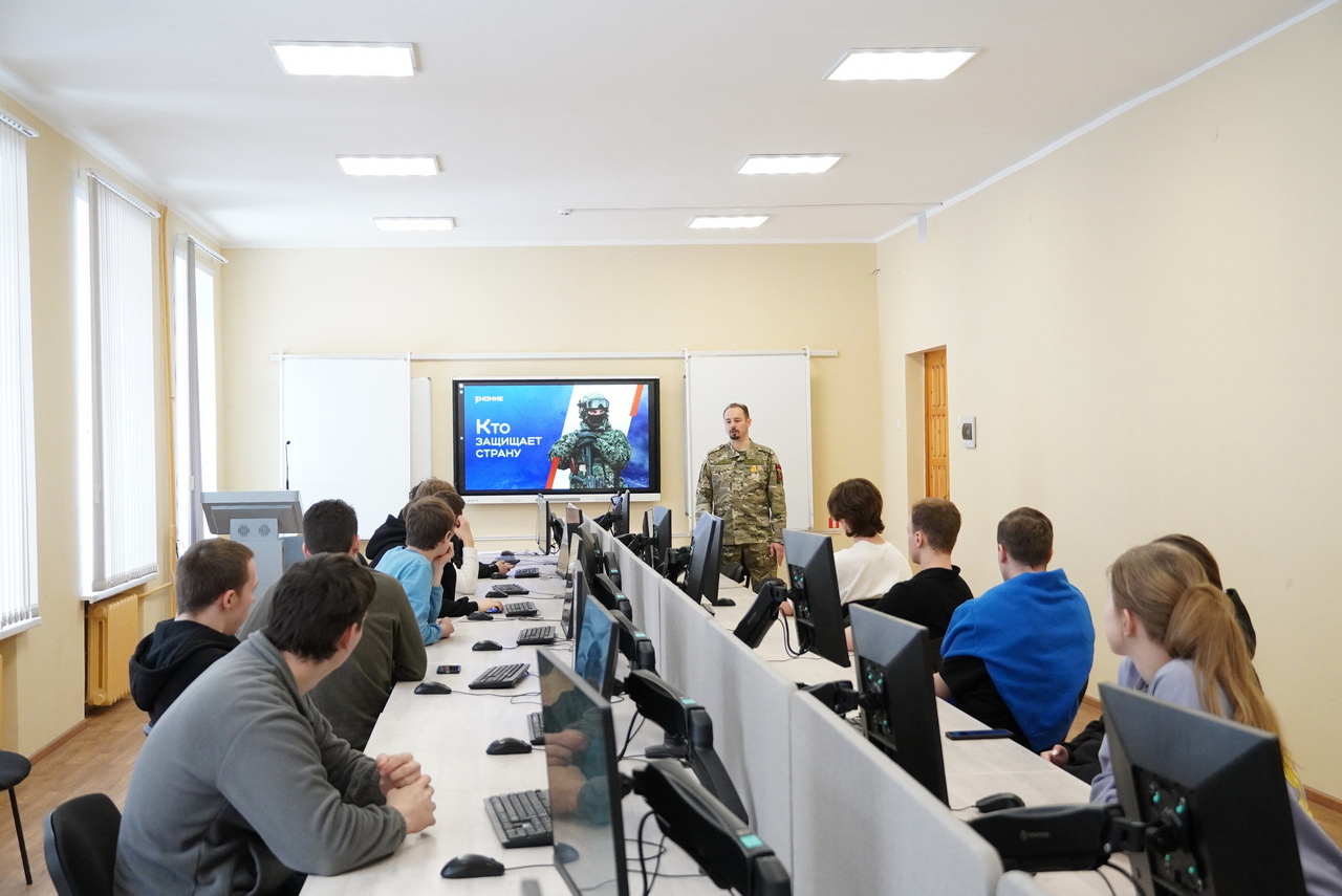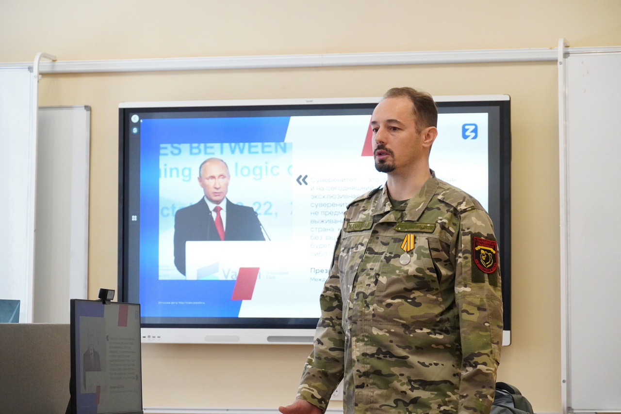 Но главным событием дня стала встреча, которая точно останется в памяти ребят надолго. Перед студентами выступил лектор Российского общества «Знание», участник СВО и выпусник СЛИ Антон Жданов.